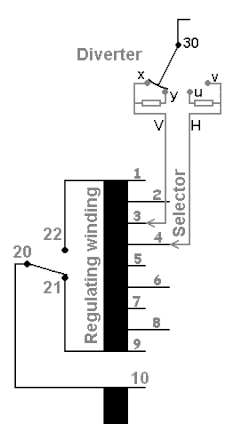 - contact schakelt naar stand y - u: nu staan de weerstanden parallel en in serie met de belasting. De weerstand van de schakelaar is dus . Omdat er nu een gesloten kring is van wikkeling 3 - 4 vloeit er een circulatiestroom die beperkt wordt door de weerstand . De spanning is nu een halve stapspanning gezakt.