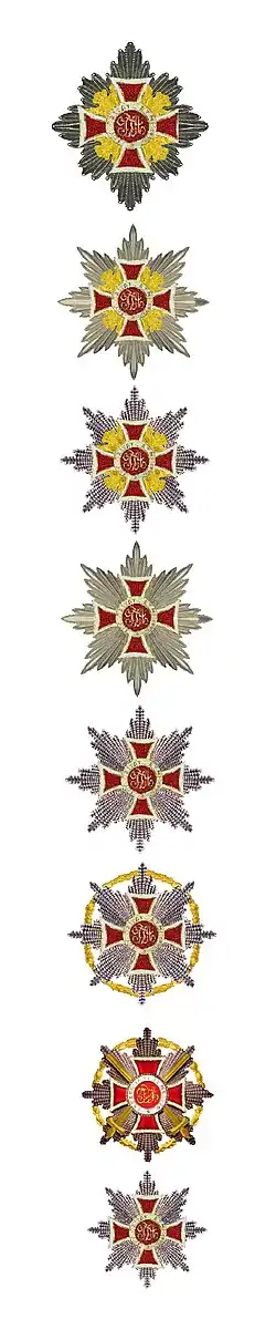 Grootkruisen die in oorlogstijd voor verdienste aan het front ("oog in oog met de vijand" schreef het statuut van de Orde) werden verleend kregen een ster met opgelegde gouden zwaarden die op een grote gouden lauwerkrans was gelegd.
