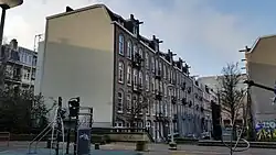 Inwoners van de straat kijken aan de westkant uit op de achtergevel van Theater Carré, die in niets doet denken aan de voorgevel van dat rijksmonument.