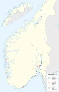 Indien het een riksvei (rijksweg) betreft, staat het wegnummer in een format die dezelfde is als de E-nummering (d.i. een wit nummer met groene achtergrond). E-wegen zijn in Noorwegen per definitie rijkswegen en dus primair. De wegnummers in het zwart met een witte achtergrond zijn fylkesveier (provinciewegen).