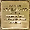 HIER WOONDE JACOB ITALIAANDER GEB. 1913 DEPORTATIE 1943 VERMOORD 31-1-1944 AUSCHWITZ |