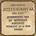 HIER WOONDE JACQUES HERMAN AA GEB. 1913 GEDEPORTEERD 1944 UIT WESTERBORK AUSCHWITZ VERMOORD 21-4-1945 DACHAU |