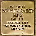 HIER WOONDE ROSINE ITALIAANDER- BLITZ GEB. 1913 DEPORTATIE 1943 VERMOORD 27-8-1943 AUSCHWITZ |