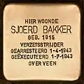 HIER WOONDE SJOERD BAKKER GEB. 1915 VERZETSSTRIJDER GEARRESTEERD 1-4-1943 GEËXECUTEERD 1-7-1943 OVERVEEN |