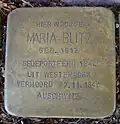 HIER WOONDE MARIA BLITZ GEB. 1912 GEDEPORTEERD 1942 UIT WESTERBORK VERMOORD 27.11.1942 AUSCHWITZ |