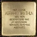 HIER WOONDE ABRAHAM VAN THIJN GEB. 1870 GEDEPORTEERD 1942 UIT WESTERBORK VERMOORD 15-10-1942 AUSCHWITZ |
