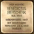 HIER WOONDE BENEDICTUS BIERSCHENK GEB. 1930 GEDEPORTEERD 1943 UIT WESTERBORK VERMOORD 23.4.1943 SOBIBOR |