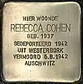 HIER WOONDE REBECCA COHEN GEB. 1937 GEDEPORTEERD 1942 UIT WESTERBORK VERMOORD 5.8.1942 AUSCHWITZ |