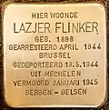 HIER WOONDE LAZJER FLINKER GEB. 1898 GEARRESTEERD APRIL 1944 BRUSSEL GEDEPORTEERD 19.5.1944 UIT MECHELEN VERMOORD JANUARI 1945 BERGEN-BELSEN |