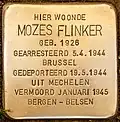 HIER WOONDE MOZES FLINKER GEB. 1926 GEARRESTEERD 5.4.1944 BRUSSEL GEDEPORTEERD 19.5.1944 UIT MECHELEN VERMOORD JANUARI 1945 BERGEN-BELSEN |
