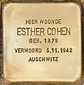 HIER WOONDE ESTHER COHEN GEB. 1879 VERMOORD 5.11.1942 AUSCHWITZ |
