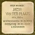 HIER WOONDE JACOB VAN DER PLAATS GEB. 1924 NEERGESCHOTEN 20-10-1944 OVERLEDEN 20-10-1944 LEEUWARDEN |