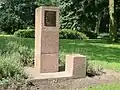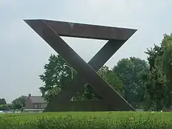 - ↑ Het beeld bestaat uit een ruw gehakte steen en uit een glad gepolijste. De tegenstelling tussen deze stenen wordt samengebracht door een RV-stalen boog (voorheen brons) en een cortenstalen cilinder.