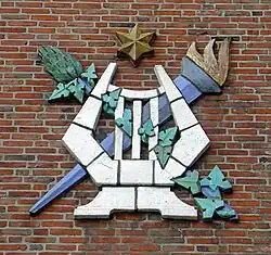 | 19?? | Tableau met harp en flambouw | Anno Smith | Kreupelstraat 10-12 / Jacobijnerstraat | Groningen | geglazuurd terracotta? | ![]() |