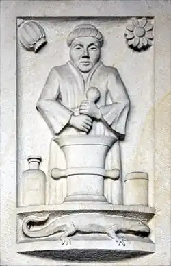| 1938 | Gevelsteen met apotheker | onbekend | W.A. Scholtenstraat 5 | Groningen | kalksteen | ![]() |