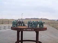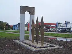 - ↑ Deel van een Romeinse weg dat nagemaakt is met een 4 meter hoge poort, (granieten zuilen opgebouwd uit messingplaten en rvs binnenwerk met daarop een messing architraaf in boogvorm), drie messing speren van ongeveer 3 meter hoog en de Romeinse weg zelf die dient als sokkel voor het kunstwerk.