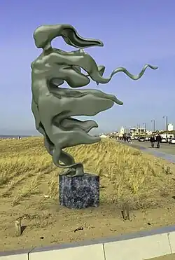 | 1988 (weggehaald in 2019 wegens nieuw zwembad iets verderop, in oktober 2020 herplaatst) | Golf | Lucien den Arend | Piet Heinlaan, bij Zwembad Aquamar | Katwijk aan Zee | roestvast staal 300x170x350 cm | ![]() ![]() |