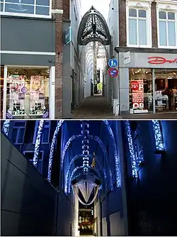 - ↑ Het zestig meter lange kunstwerk Passage de la Baleine (Passage van de Walvis) hangt als een overkapping over de gerenoveerde steeg. Het verbeeldt het enorme skelet van een walvis. Het kunstwerk, dat 's avonds wordt verlicht met blauwe en witte ledlampjes, moet de steeg als looproute tussen de Nieuwestad en Ruiterskwartier, een vriendelijker karakter geven.