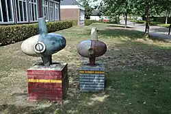 - ↑ Bestaat uit drie sculpturen:in gietijzer gegoten veren, een schijf van cortenstaal en een beeld in brons van “ de Zorgdrager“ (dokter Ger Beckers)