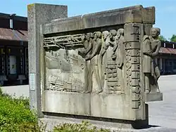 - ↑ Gevelsteen is afkomstig van de verwoeste Bijenkorf in Rotterdam en dateert uit 1930