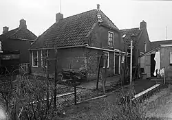 Dit huis is in 1845 in Zwaag gebouwd. Bij de afbraak in 1976 bleek dat het bijna geheel is samengesteld uit onderdelen van een groot 18e-eeuws huis. Volgens overlevering kwam dat huis uit Enkhuizen. Dat is niet onwaarschijnlijk, aangezien grote delen van het verarmde Enkhuizen aan het begin van de negentiende eeuw afgebroken en als puin verkocht werden. Aan de ingang en de stoep is deze oorsprong nog te herkennen. Tot 1908 woonde hier de huisschilder Jan Hendrik Sagekuele, die achter de woning zijn werkplaats had. In 1935 begon het echtpaar Pistoor een kapperszaak in de zijkamer van het huis. De zwart-witopname toont de originele situatie.[44] | ![]() |