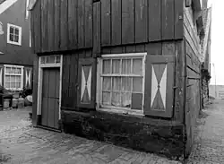 Jannetje Post erfde deze woning van haar vader Fokke Post. Zij woonde er met haar gezin vanaf het begin van de twintigste eeuw. Haar grootvader had het huis in 1859 gebouwd. In het huis zijn onder andere balken verwerkt, afkomstig uit huizen die op Schokland waren gesloopt. Alle mannen in de familie van Jannetje waren visser. Zij visten op haring en ansjovis in de Zuiderzee. In de winter werd er tong, schol en wijting gevangen op de Noordzee.[3] De zwart-witopname toont de originele situatie. | ![]() ![]() |