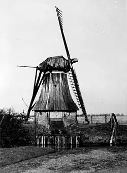 De molen, een achtkantige bovenkruier, is afkomstig uit Hemelum; hij stond aan de rand van de Vogelhoekspolder, waar hij vanaf het midden van de negentiende eeuw tot 1947 het water heeft uitgemaald op de Morra. Hij bemaalde een gebied van ongeveer 50 hectare. De houten vijzel van de molen draait in een bak en schroeft het water als het ware omhoog. In 1947 verving een gemaal de molen, die daarna snel in verval raakte. | ![]() |