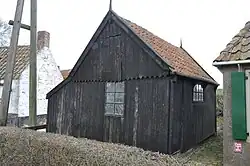 De vissers van de regel Slingerhaan gebruikten deze schuur als opslagplaats voor hun boten, fuiken en stokken. Zij visten gezamenlijk op haring door fuiken in een lange rij haaks op de dijk in het water uit te zetten, een zogenaamde regel. | ![]() |
