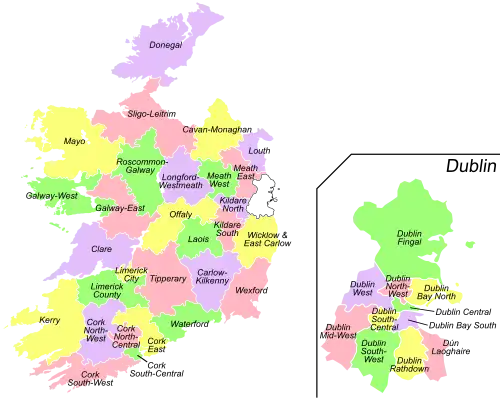 Bij de laatste verkiezingen voor Dáil Eireann, in 2016, was de Republiek Ierland verdeeld in de volgende 40 kiesdistricten:[1]