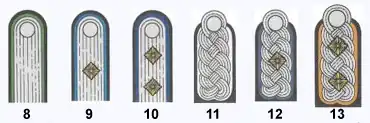 - Unterwachtmeister der Schutzpolizei (1), Rottwachtmeister der Schutzpolizei (2), Wachtmeister der Schutzpolizei (3), Oberwachtmeister der Schutzpolizei (4), Revier-Oberwachtmeister der Schutzpolizei (5), Hauptwachtmeister der Schutzpolizei (6), Meister der Schutzpolizei (7), Leutnant der Schutzpolizei (8), Oberarzt der Polizei (9), Stabsarzt der Polizei (10), Regierungsrat (11), Oberfeldarzt der Polizei (12), Oberst der Gendarmerie (13), SS-Brigadeführer und Generalmajor der Polizei (14), SS-Gruppenführer und Generalleutnant der Polizei (15), SS-Obergruppenführer und General der Polizei (16), SS-Oberstgruppenführer und Generaloberst der Polizei (17), Reichsführer SS und Chef der Deutschen Polizei (18)