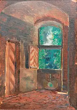 Hal met half openslaande deur | Olieverf op karton | 33x47cm | Private collectie | |