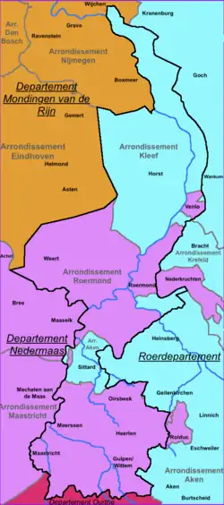 Na de Franse Tijd, bij de vorming van het Verenigd Koninkrijk der Nederlanden, werd het voormalige departement, tezamen met een deel van het Roerdepartement, een nieuwe provincie, die op gezag van de nieuwe koning Willem I in haar geheel Limburg werd genoemd. Hieraan lagen deels historische, deels strategische redenen ten grondslag. Zo hoorden de huidige drie meest noordelijke gemeenten Mook en Middelaar, Gennep en Bergen, waar geen Limburgs maar Kleverlands, wordt gesproken en die voordien nog bij Pruisisch Opper-Gelre en Kleef hoorden, van 1803 tot 1815 nog bij Pruisen, evenals Arcen en Velden, maar omdat de toekomstige koning Willem I bij het Congres van Wenen liever geen Pruisen aan de Maas zag, werd deze strook op de rechteroever overgedragen aan het nieuwe Verenigd Koninkrijk. Om dezelfde strategische redenen zijn tegelijkertijd ontbrekende, cruciale puzzel-elementen als het voordien Gulikse gebied van het ambt Born (met Susteren) en de stad Sittard, dat met Urmond en Grevenbicht tot aan de Maas reikte, alsmede de Gulikse Maashaven bij Tegelen en Steyl, definitief bij de nieuwe provincie Limburg gekomen. In ruil daarvoor verkreeg Pruisen onder meer gebiedsdelen bij 's-Hertogenrade en bij Elmpt/Niederkrüchten, die tot de Nederlanden behoord hadden.