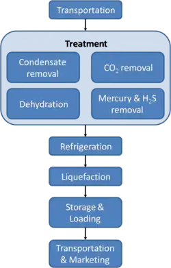 Lng wordt geproduceerd in lng-fabrieken aan land, er zijn ook plannen voor drijvende lng-fabrieken die in afgelegen offshore-gasvelden ingezet kunnen worden (analoog aan FPSO). Na de winning verwijderen gaswassers ongewenste gassen zoals koolstofdioxide, omdat die de installaties kunnen beschadigen. Het schone aardgas wordt vervolgens naar een koelinstallatie geleid (Engels: trained) en daar in stappen afgekoeld tot vloeibaar gas. Onderwijl kunnen verschillende bestanddelen afgescheiden worden die een van methaan afwijkende condensatietemperatuur hebben.