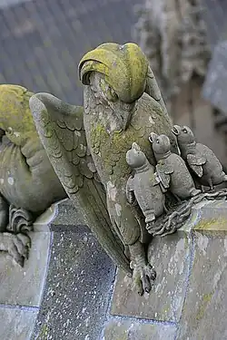 - Omkijkend monster. Vermoedelijk waren van het origineel alleen de poten nog achtergebleven, want die passen niet goed bij de rest van het beeldje. Het beeldje is een beest met drakenvleugels en een zwanenkop.