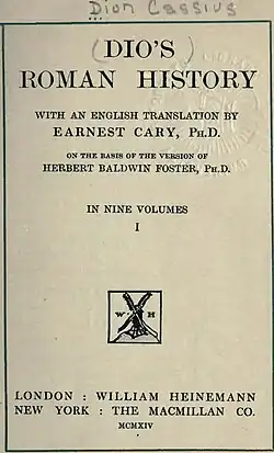 - (en) Roman History (Cassius Dio). Engelse vertaling van Prof. Earnest Cary (1914 tot 1927), destijds gepubliceerd in Loeb Classical Library; nu op website penelope.uchicago.edu.