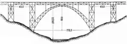 De brug werd via de methode van de vrije voorbouw gebouwd, dat wil zeggen dat de hoofdboog zonder verdere hulpconstructies gebouwd is. De hoofdboog heeft een overspanning van 170 meter. De lengte van de staalconstructie is 465 meter. In totaal werden voor de bouw van de brug 5000 ton staalprofielen en 950.000 klinknagels gebruikt. Op 15 juli 1887 werd de brug geopend.