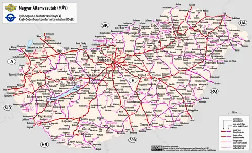 Het netwerk van de MÁV beslaat 7664 kilometer.[ 2] Hiervan is 7394 kilometer in normaalspoor uitgevoerd, 176 kilometer in smalspoor (760 mm) en 36 kilometer in breedspoor (1524 mm). Dit breedspoor wordt gebruikt voor de verbindingen met buurland Oekraïne .