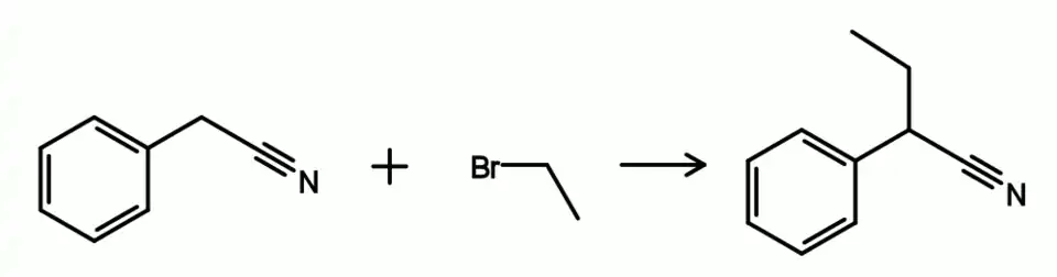 Voorbeeld: fenylacetonitril en broomethaan reageren tot fenylethylacetonitril (2-fenylbutyronitril) (in aanwezigheid van NaOH als sterke base en benzyltriethylammoniumchloride als katalysator):