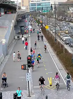 Reizigers naar Brooklyn gebruiken een fietspad in Warren Street en een eenrichtingsfietspad (geopend in september 2008) door het noordelijke uiteinde van City Hall Park om verbinding te maken met de Brooklyn Bridge. Degenen die uit Brooklyn aankomen, gebruiken de rijstroken in Park Row en Murray Street om de Greenway te bereiken.