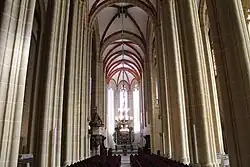 Het interieur van de hallenkerk laat zich verdelen in vier rijen van steeds vijf slanke, hoge zuilen. Op de galerij was in de middeleeuwen een bibliotheek ondergebracht. Het transept van de kerk heeft dezelfde breedte als het middenschip en overtreft met de einden dus niet de totale breedte van de kerk.