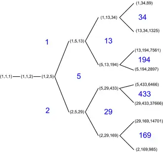 De oplossingen van de vergelijking kan men in een binaire boom voorstellen. Elke oplossing is daarbij de "ouder" van twee verschillende oplossingen die volgens het hierboven beschreven mechanisme eruit zijn afgeleid (met of zonder permutatie).
