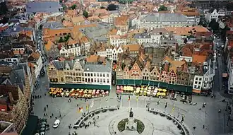 Midden op het plein staat het standbeeld van Jan Breydel en Pieter de Coninck, de twee lokale volkshelden die in 1302 een grote rol speelden in het Vlaamse verzet tegen de Franse koning, met de Guldensporenslag tot gevolg.