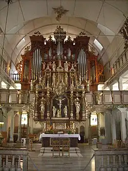 Het interieur dat omsloten wordt door meerdere galerijen heeft een decoratieloos tongewelf. Alle aandacht gaat uit naar het indrukwekkende altaar met orgel, de kansel en het doopvont.