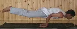 Deze houding begint liggend op de buik. Beide handpalmen worden naast de taille op de grond gezet. Het lichaam ligt in een volledig rechte en horizontale lijn, met de tenen en de kin in de grond. Dan wordt het lichaam in zijn geheel in balans omhoog geheven, zodat het alleen nog op de handpalmen rust. Het lichaam blijft parallel met de grond.