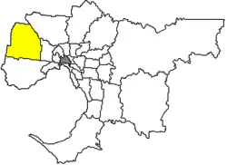 Locatie van Shire of Melton (geel) in Melbourne | |||