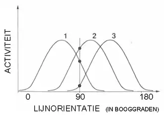 Voorbeeld van grove codering. Horizontaal: lijnoriëntatie, verticaal: activiteit (vuurfrequentie) van drie denkbeeldige zenuwcellen. Elke cel vuurt bij meerdere oriëntaties van een lijnstuk. Er zijn drie zenuwcellen nodig om een verticale lijn te kunnen waarnemen. Cel 2 vertoont grootste activiteit, cel 1 een kleinere en cel 3 de kleinste activiteit
