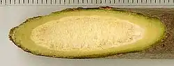 Tangentiale doorsnede van een 4-jarige stam:0 = merg; 1 = grens jaarring; 2 = harskanalen; 3 = primaire mergstralen; 4 = secundaire mergstralen; 5 = cambium; 6 = mergstralen in de bast; 7 = kurkcambium; 8 = bast; 9 = schors