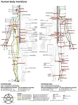 Stimulatie van bepaalde punten – bijvoorbeeld door acupunctuur of acupressuur – zou genezend werken, maar de tradities verschillen van mening over de ligging en de kenmerken van de banen en punten. Er is geen geneeskundige waarde bekend van dit begrippenkader.