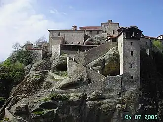 Het huidige klooster werd gebouwd ± 1490, maar volgens deskundigen boven op de overblijfselen van een ouder klooster. Bouwkundige kenmerken en resten van muurschilderingen wijzen er op dat de kerk stamt uit de 13e/14e eeuw. Omdat de top van de rots waar het op staat klein en smal is, zijn de kloostergebouwen niet horizontaal uitgebreid, maar verticaal, in verschillende verdiepingen. Zo staan de kloosterkerk en de refter op de eerste, de cellen van de monniken op de tweede verdieping. Opvallend zijn de bescheiden afmetingen van de kloostergebouwen: er was slechts plaats voor tien cellen. De centrale kloosterkerk is toegewijd aan de heilige Nikolaas. Het smalle gebouw, met een lage koepel zonder ramen (want er ligt nog een verdieping boven), werd begonnen enkele jaren voor 1510 en voltooid in 1527. De muurschilderingen zijn uitgevoerd door de monnik-kunstschilder Theophanis Strelitzas uit Kreta: hoewel de beperkte ruimte technische problemen opleverde, slaagde hij er toch in het iconografische programma, zoals dat in de tijd van de Paleologen-keizers (1259-1453) vorm had gekregen, volledig uit te voeren.