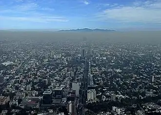 Mexico-Stad is gebouwd in de Vallei van Mexico. Deze vallei wordt aan alle kanten omgeven door vulkanen (waaronder de Popocatépetl). Dit heeft als gevolg dat luchtvervuiling, zoals smog blijft hangen. Er wordt weleens gezegd dat een dag lucht inademen in Mexico-Stad gelijkstaat aan een pak sigaretten roken. Vooral in de wintermaanden, wanneer de lucht boven de vallei koud is en de warme lucht uit de stad (door inversie) niet kan opstijgen, is de luchtvervuiling sterk. De Popocatépetl, in de Azteekse en koloniale periode vanuit de stad goed zichtbaar, kan door de smog nog zelden vanuit de stad gezien worden.
